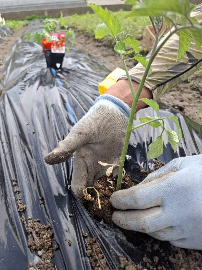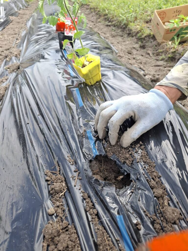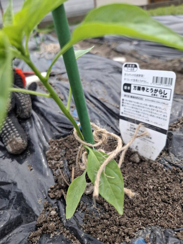 手順は①移植ごてなどでシートに穴を空ける②穴の下の土を少し掘り下げる③そこに作物の苗を収める④苗の周囲にやさしく土をかぶせるーーといたって簡単である。10株の苗についてこの作業をやったあと、⑤それぞれの苗のそばに支柱(ぴょんたが持ってきた)を立てる⑥麻紐で苗と支柱を結びつけ、苗を安定させる。