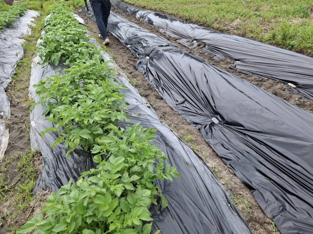 今回は、さらに1本半の畝(長さにして十数㍍)にジャガイモ以外の作物を植え、畑地を広げることにした。広げる範囲には既に肥料を施してあるので、昨日の作業は、鍬を使って畝の形をいま一度整え、雑草よけのシートをかぶせるところからスタートした。プラスチック製の留め具でシートを固定するまで、およそ1時間ほどかかった。
